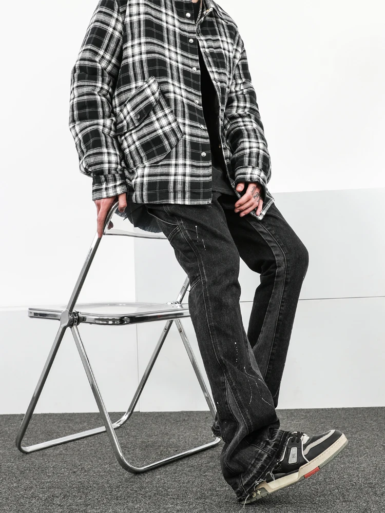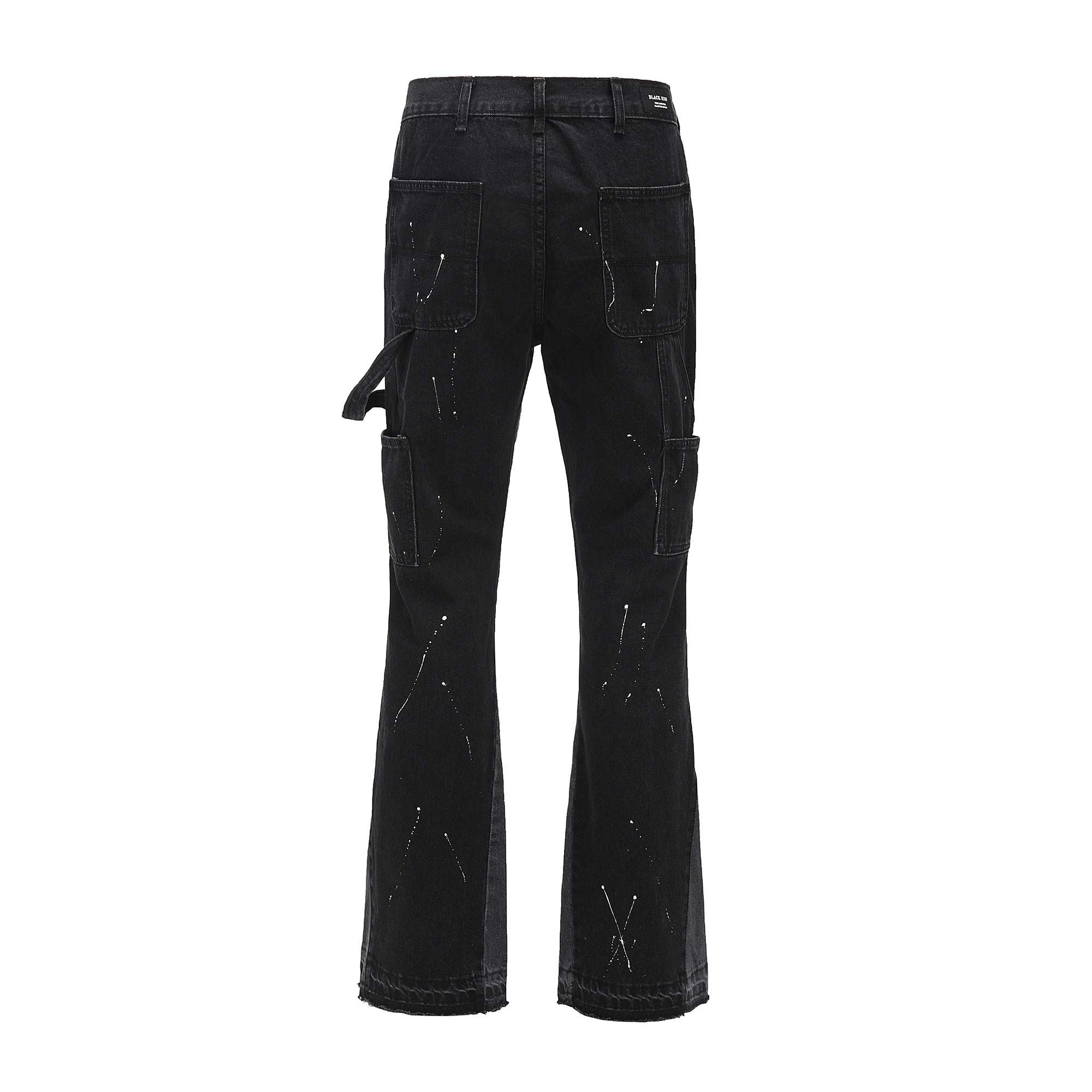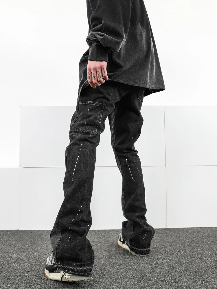 Men Street Wear Flare Pants Black Graffiti Wide Leg Jeans Hip Hop Splashed Patchwork Slim Fit Cargo Flared Denim Pants for Men